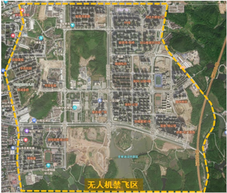 以沙岗湖路、凤凰大道、S274省道及金星湖自然景区为边界,区域范围内空域临时管控,禁止放飞任何无人驾驶航空器。